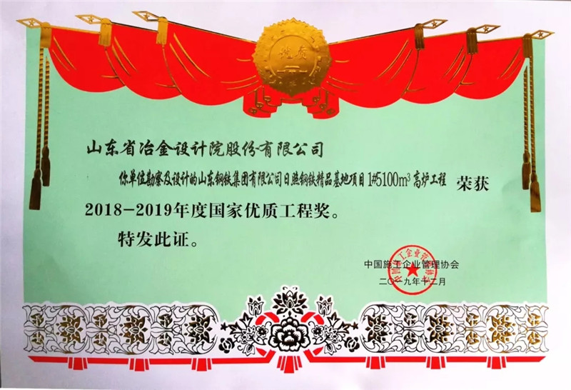 128日,2018-2019年度國家優質工程獎總結表彰大會在國家會議中心舉行,由山冶設計總體規劃、自主設計并采取“EPC”總承包模式建成的山鋼集團日照精品基地1#5100m3高爐工程喜獲國家優質工程獎。