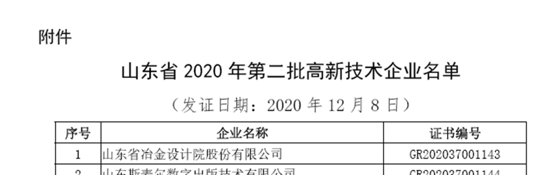 1月15日,根據(jù)全國(guó)高新技術(shù)企業(yè)認(rèn)定管理工作領(lǐng)導(dǎo)小組辦公室印發(fā)的《關(guān)于山東省2020年第二批高新技術(shù)企業(yè)備案的復(fù)函》,公司順利通過(guò)了2020年度國(guó)家高新技術(shù)企業(yè)認(rèn)定。