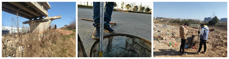 本次現場實測數據包含現狀鐵路橋橋墩坐標、橋梁凈空,已建設道路交叉口坐標及高程,已施工雨、污水井坐標及井深等,測量項目涉及到“陽邏之心”50多萬平方米二十余條道路,測量范圍廣闊,測量目標眾多,而測量人員僅為王學皓、吳修業及二十冶測量技術員陳工,實測任務異常艱巨。現場多為半施工或未施工道路,測量情況十分復雜,并同時遭遇武漢強降溫天氣,踏勘工作面臨極大考驗。尤其在雨污水井數據測量方面,部分道路車流量較大,需搭設臨時圍擋保證測量安全;部分重型井蓋受重載車輛碾壓密實變形,現有工具簡陋,僅打開井蓋這一項往往需要數十分鐘,完成單個井數據測量至少需要一個多小時,遠遠超出預估時間。與時間節點競速,測量人員踏霜踩露而出,披星戴月而歸,歷經四天全力以赴、克難攻堅,圓滿完成所有測量任務,為設計工作順利進行提供了有力的數據支持。