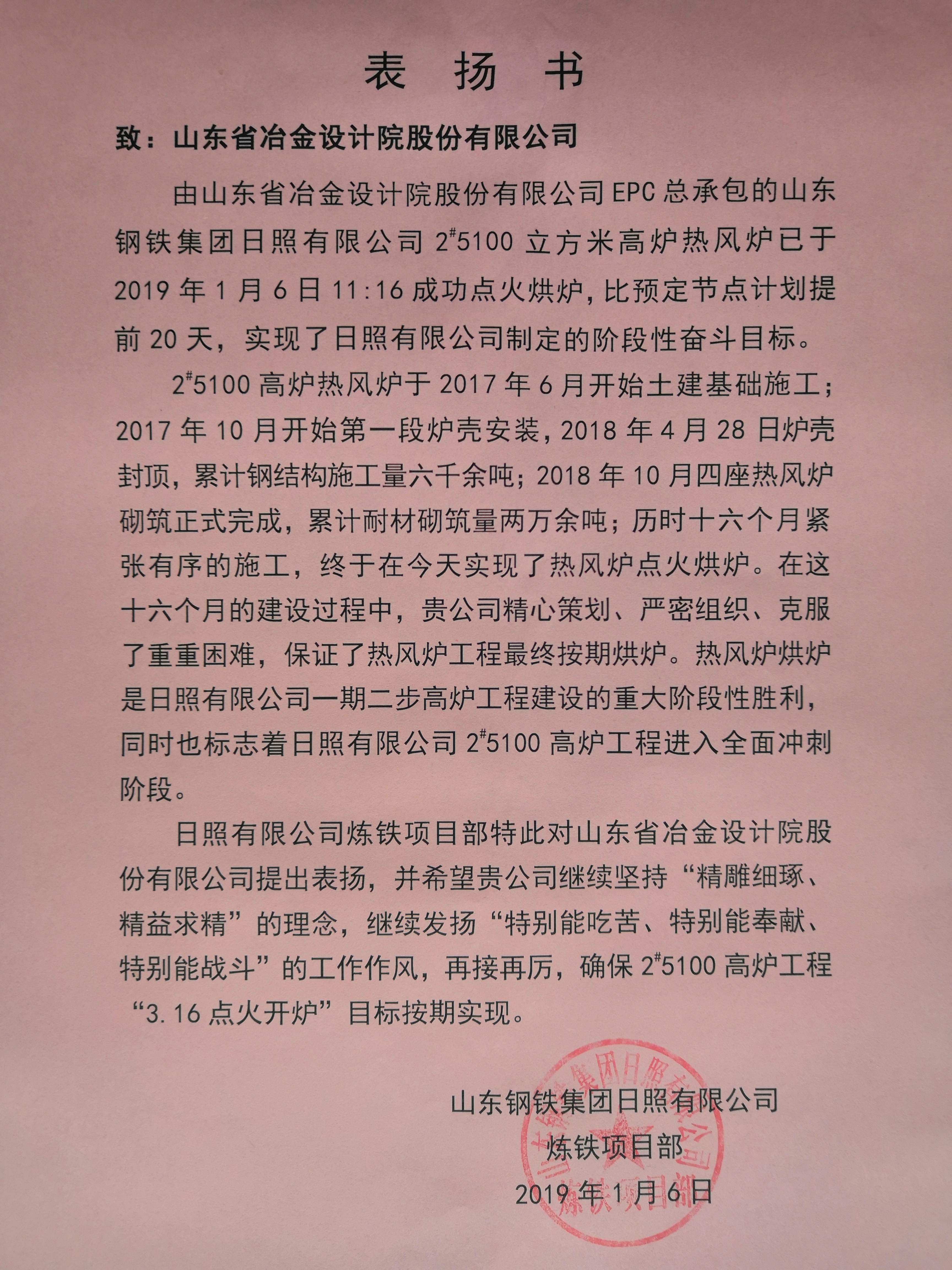 2019年1月6日11時16分,隨著山鋼集團(tuán)日照公司副總經(jīng)理王子金:“我宣布山東鋼鐵集團(tuán)日照精品基地2#5100立方米高爐熱風(fēng)爐點(diǎn)火烘爐開始”的號令, 由我公司總包的山鋼集團(tuán)日照精品基地2#5100立方米高爐熱風(fēng)爐正式點(diǎn)火烘爐。這標(biāo)志由公司總承包2#5100立方米高爐工程熱風(fēng)爐烘爐的重大節(jié)點(diǎn)比計劃提前20天實(shí)現(xiàn)階段性奮斗目標(biāo)。公司副總經(jīng)理劉洪亮參加烘爐儀式并發(fā)表了講話。當(dāng)天,山東鋼鐵集團(tuán)日照有限公司向公司發(fā)來了表揚(yáng)書,贊揚(yáng)山冶人堅持“精雕細(xì)琢、精益求精”的理念,希望再接再厲確保后續(xù)工作目標(biāo)如期實(shí)現(xiàn)。