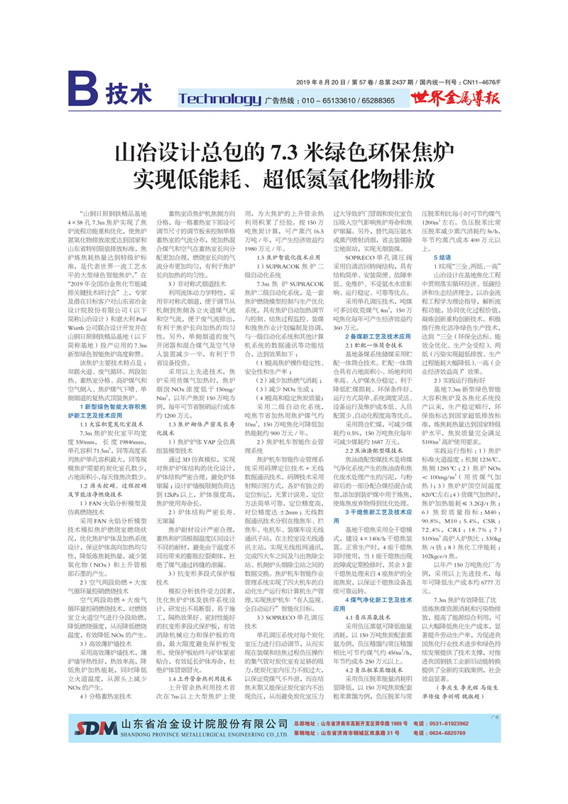 山冶設計總包的7.3米綠色環保焦爐實現低能耗、超低氮氧化物排放
